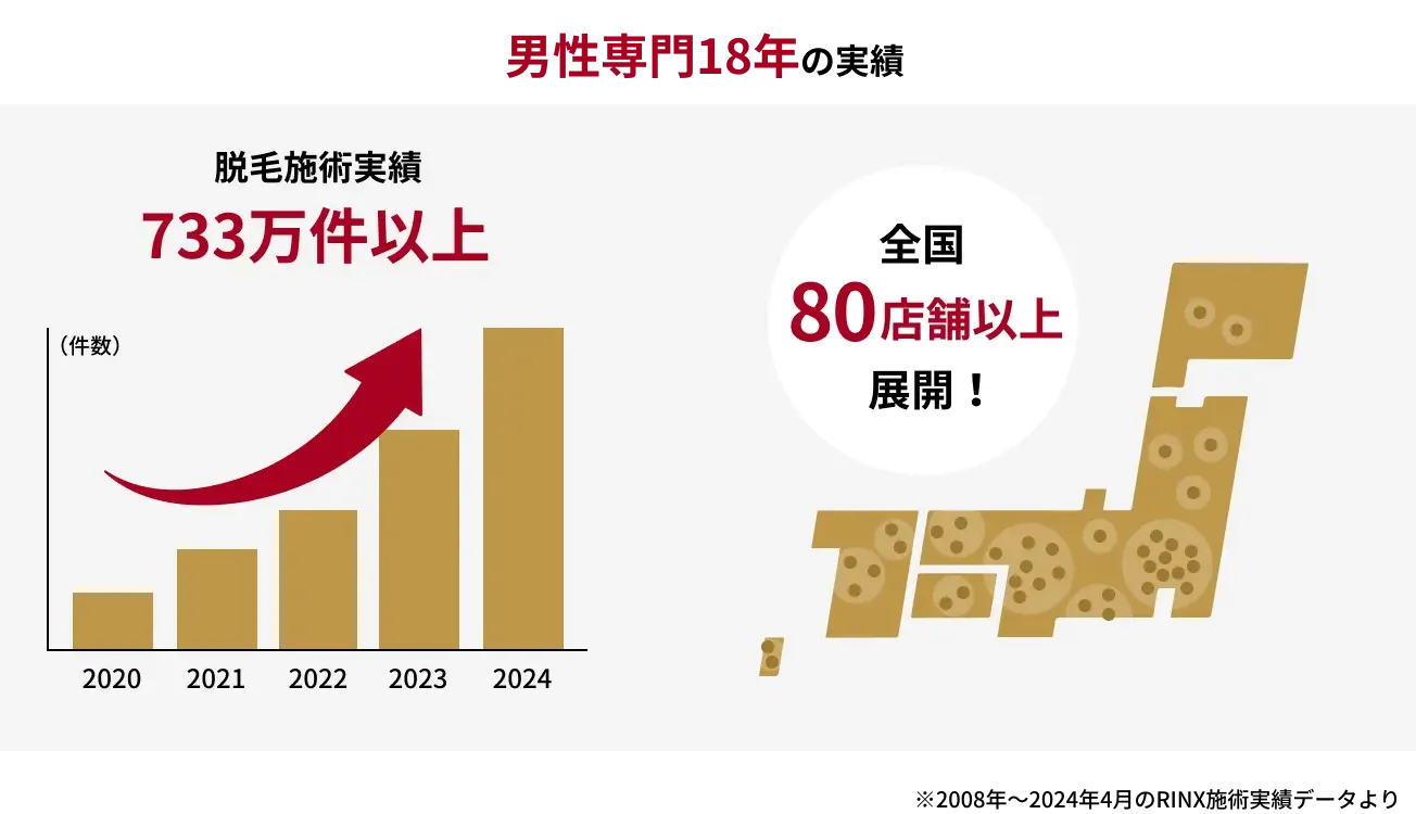 RINXはメンズ脱毛業界で18年の実績、733万件以上の施術データを保有。全スタッフが認定書取得施術者の男性で、十人十色の毛の悩みに合わせた施術を提供。脱毛のその先まで、あなたの人生を二人三脚でサポートいたします。