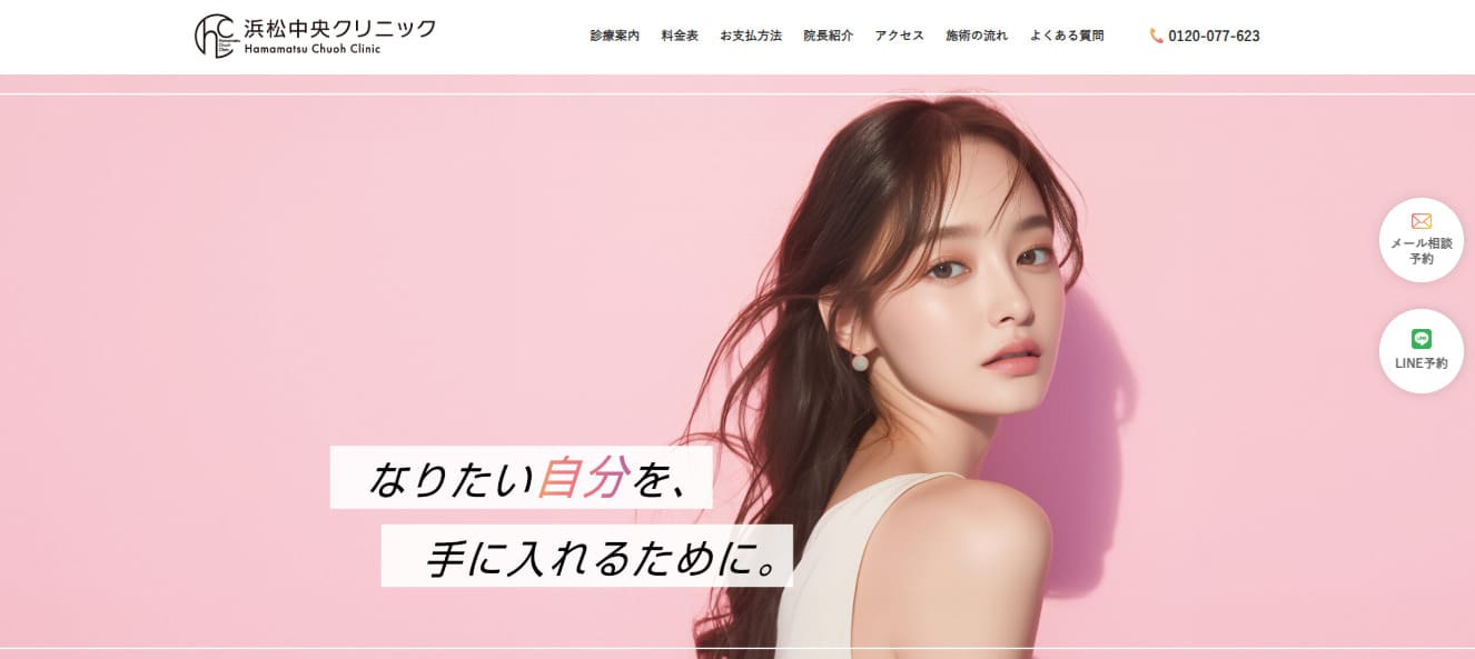浜松中央クリニックは地域密着型の医療クリニックで、土日祝日営業はもちろんのこと、診療時間も朝9:30から20:00までと近隣のサロンやクリニックに比べて営業時間が長いことも特徴です。JR浜松駅から徒歩5分とアクセスもしやすいです。