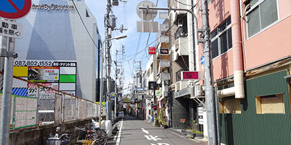 片原町改札を出ていただき、左手に進みすぐの商店街を右手(西方向)に曲がり4分(350m)ほど歩きます。