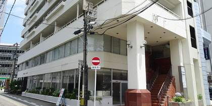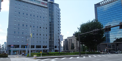 富山駅前中央交差点の横断歩道を渡り、右手に明治安田生命ビルがございます。三叉路を左手方向に進んでいただきます。