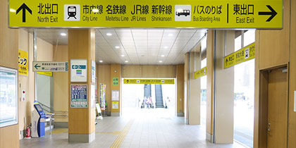 JR・名鉄豊橋駅の改札口を出て右に曲がります。カルミア前をそのまま直進し、東口から外に出て右に曲がり、突き当たりの階段を下ります。